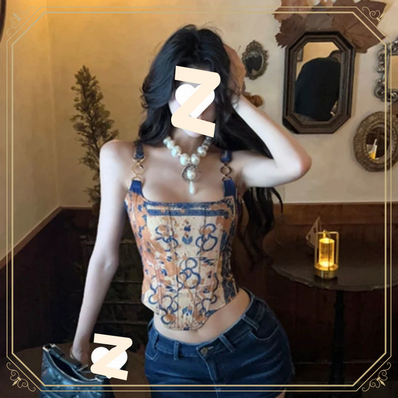 アメリカンレトロなスネークプリントフィッシュボーンスリムコントラストカラーキャミソールレディース2025夏新作ライト大人スタイルトップ