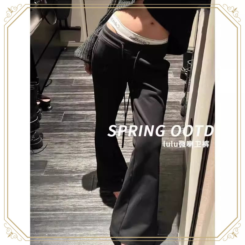 女性用ブラックマイクロフレアスウェットパンツ2025春秋新作カジュアルスリムフィットアメリカン馬蹄スウェットパンツポケット