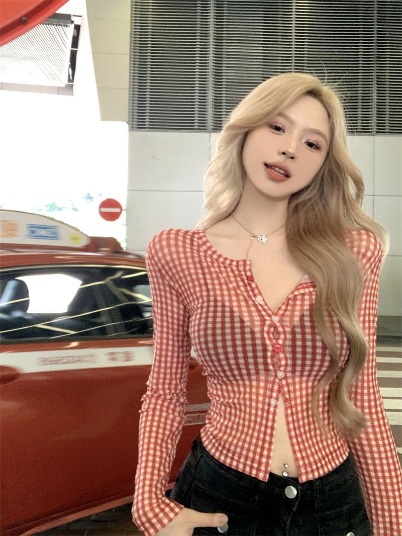 红色格子长袖防晒衬衫女秋季修身网纱美式辣妹设计感显瘦短款上衣