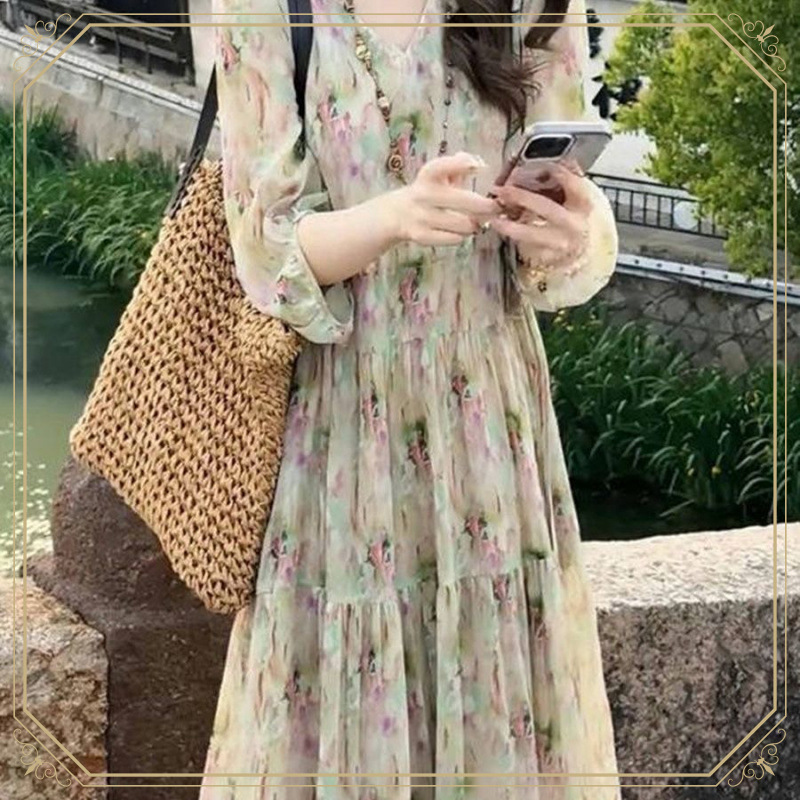 リゾートスタイルフレンチスタイルプリントドレス女性のための 2025 夏の新しいルーズスリムレースアップウエストロングスカート