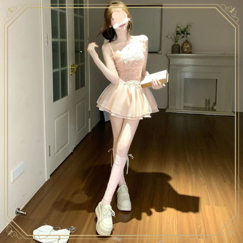 2025 甘い不規則なホットガールサマートップ新しいスーツ花のつぼみスカートスーツノースリーブ甘くてスパイシーなセット