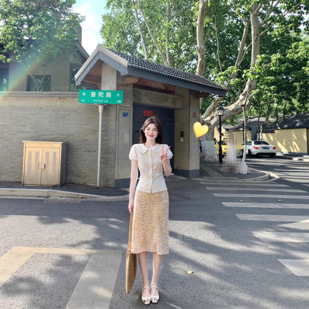 度假风甜美少女感娃娃领短袖修身衬衫女夏季高腰碎花半身裙两件套