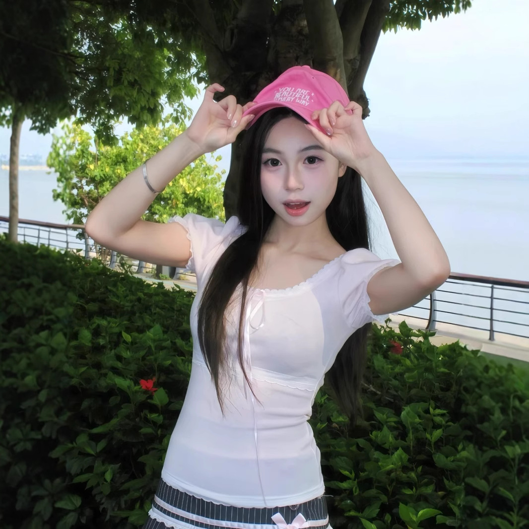 フレンチリボンレーストップ女性の夏のデザインシックな甘辛な着用レースパフスリーブショートTシャツ