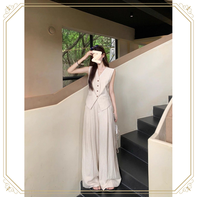 大きいサイズのレディース高級スーツ、Vネックベスト+ハイウエストワイドパンツ、オールドマネースタイルのツーピースセット