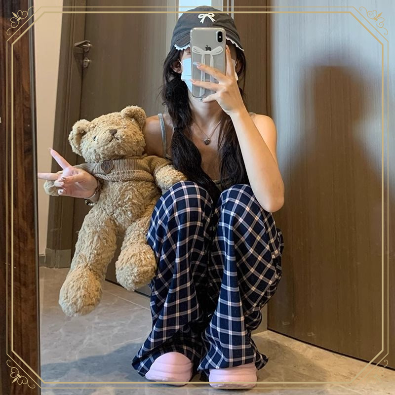 Zhao Lusiと同じスタイルの女性用チェック柄パンツ2024年夏新作ドレープレイジーレトロワイドレッグパンツポケット付き