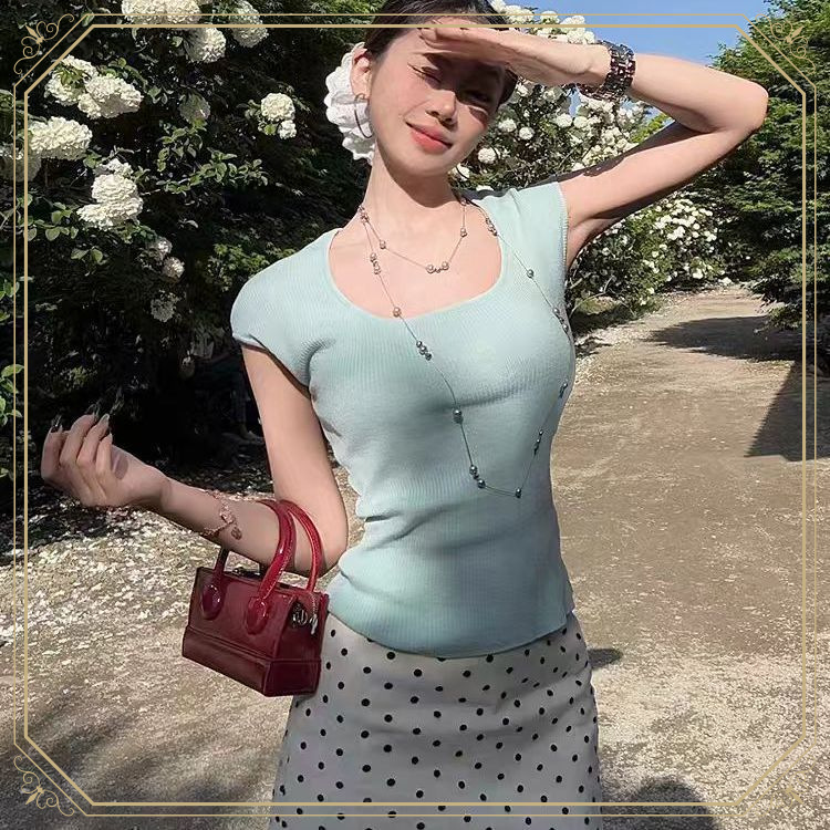 夏の韓国風の雰囲気の淑女、優しくて甘い気質、ミントグリーンのトップス、女性の半袖水玉スカートスーツ、無地