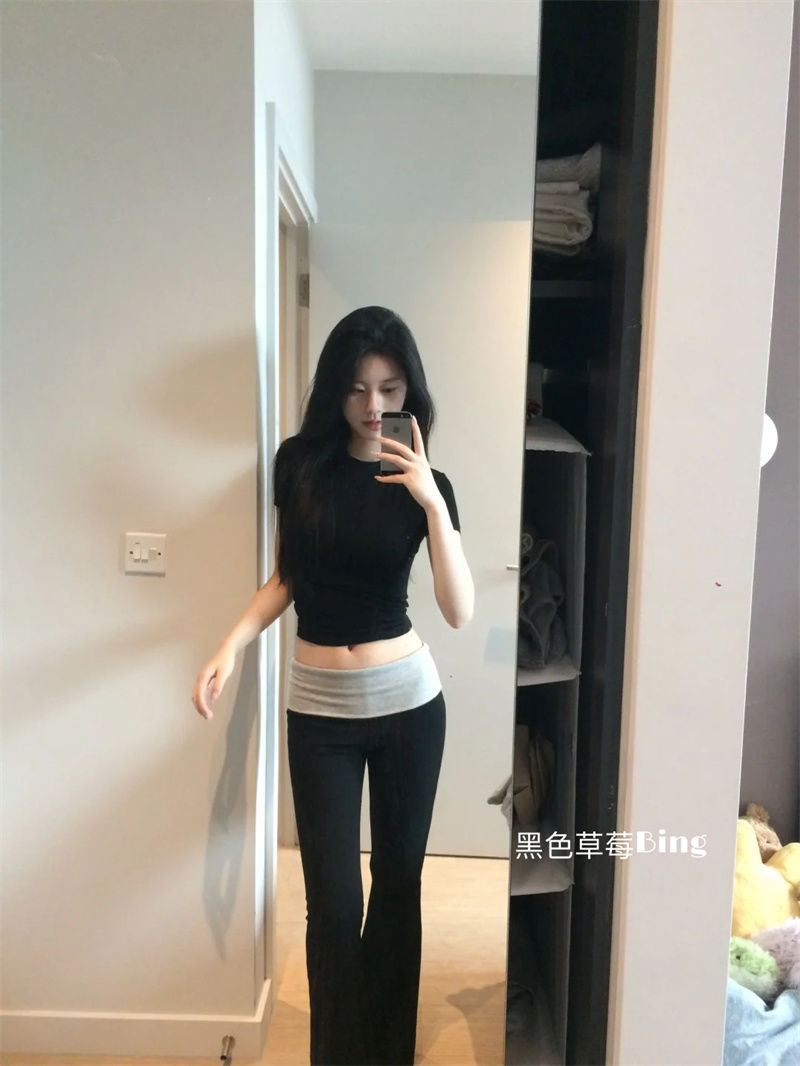 アメリカンホットガールデザインコントラストカラーハイウエストマイクロフレアカジュアルパンツ馬蹄パンツショートTシャツトップ2点セット