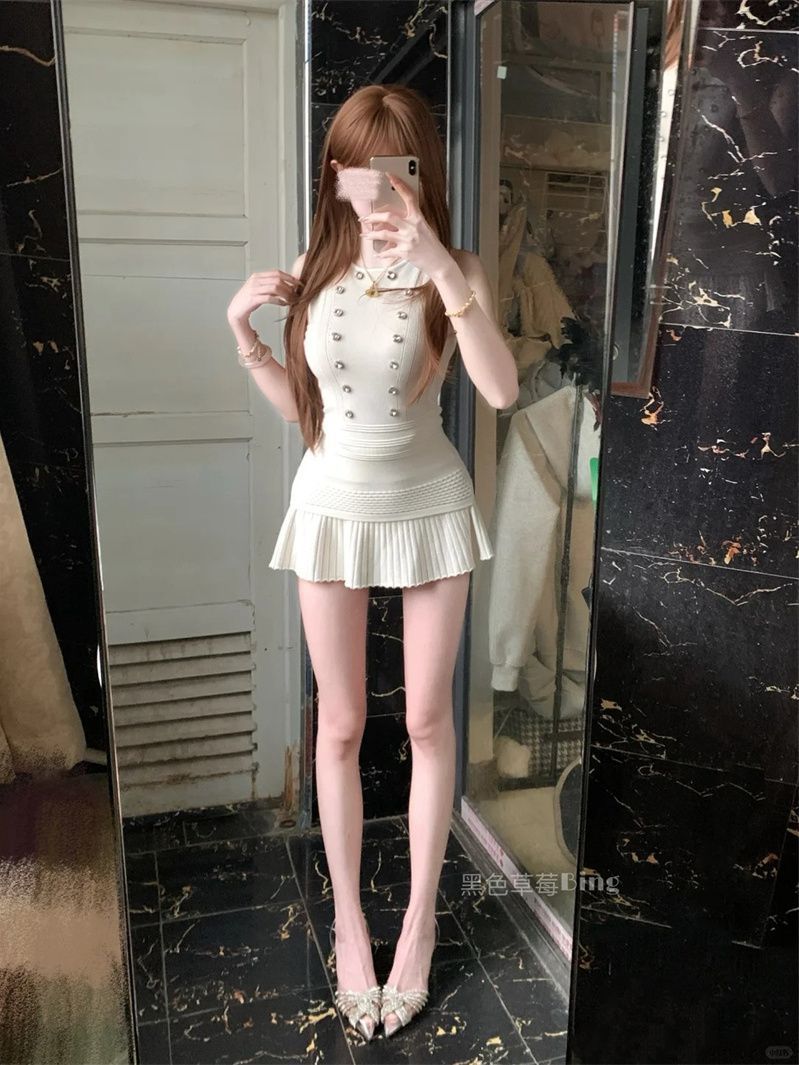 纯欲辣妹风高级感钉珠无袖针织背心上衣女夏季高腰百褶半身裙套装