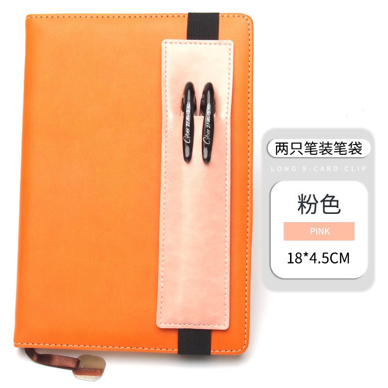 ノートのメモ帳の上に革のペンカバーを巻いています。