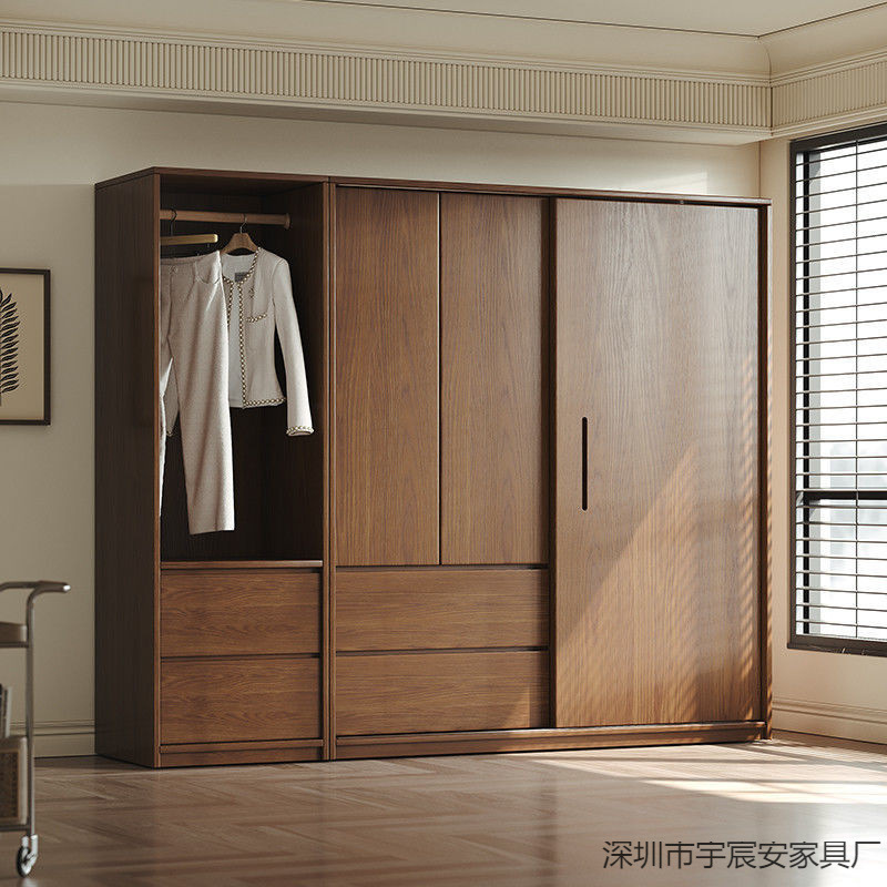 無垢材オーク引き戸ワードローブホームベッドルームモダンシンプルワードローブ引き戸ウォールナットカラー大型ワードローブ