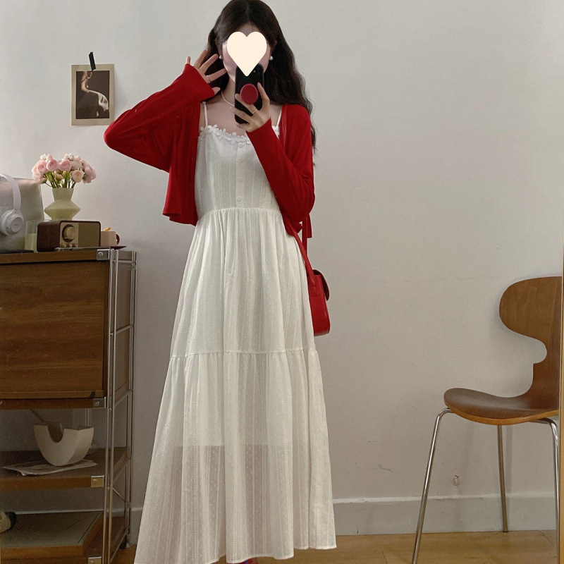 女性用スーツ 2025 夏甘いウエスト花柄サスペンダードレス A ラインスカートカーディガントップツーピースセットストレートヘア