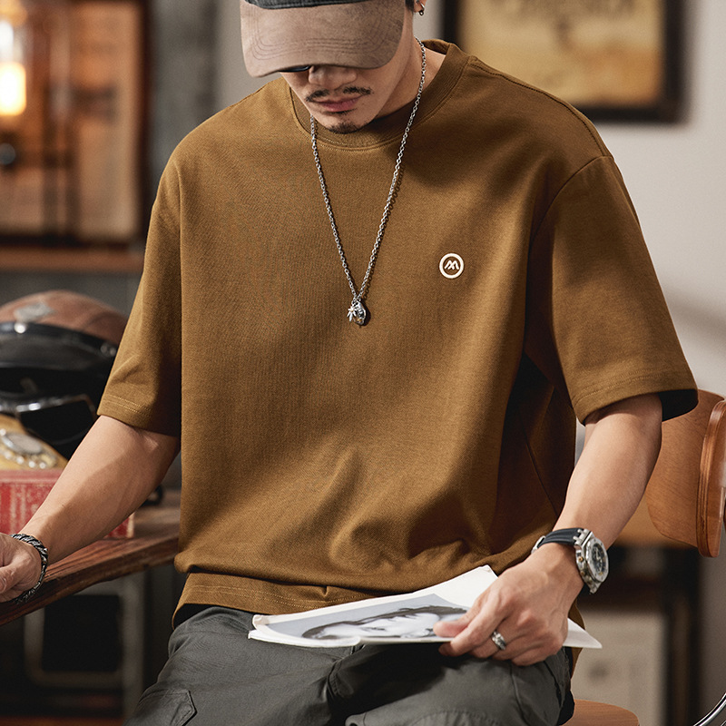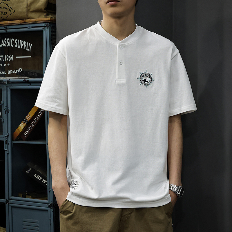 ハイエンドアメリカンレトロヘンリーカラー半袖Tシャツメンズ夏の新しいヘビーウェイトコットンルーズカジュアル刺繍Tシャツ