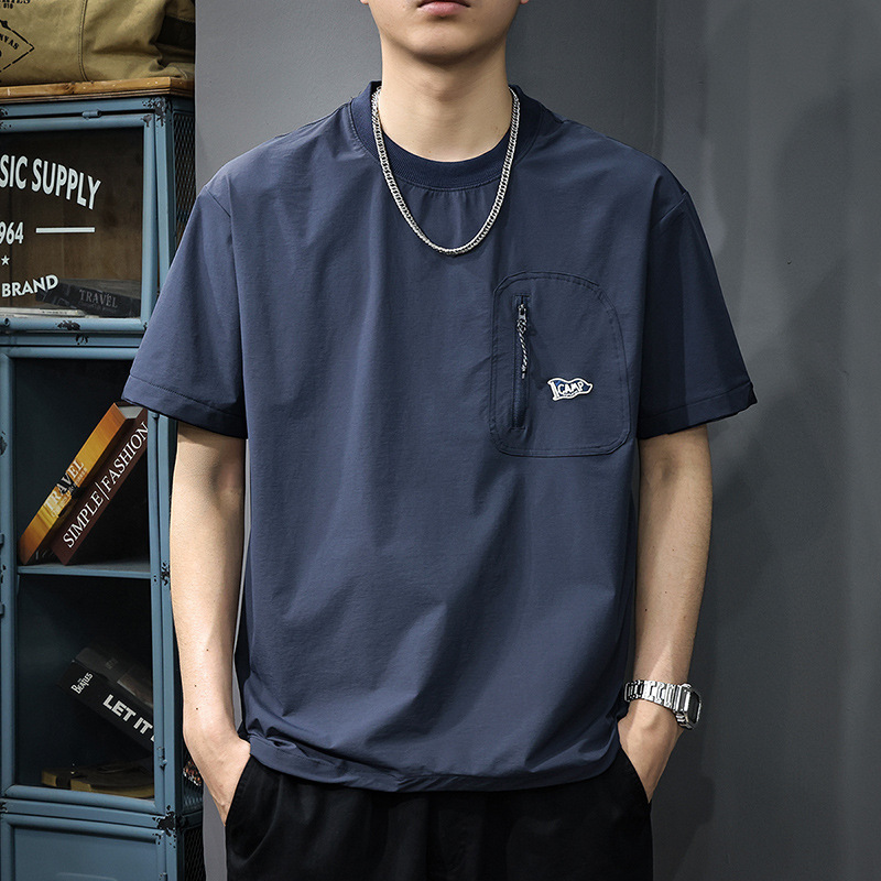 夏のアウトドアパーソナライズポケット半袖メンズ 2025 アメリカの新しいスタイルネックライン糸編組ラウンドネックルーズ Tシャツ