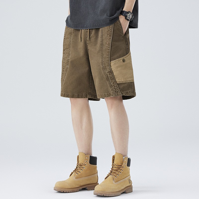 ブラウンコットンカーゴショーツメンズ2025新しいアメリカンレトロトレンディブランドスプライシングダメージ加工アウターウェア男性用5点パンツ