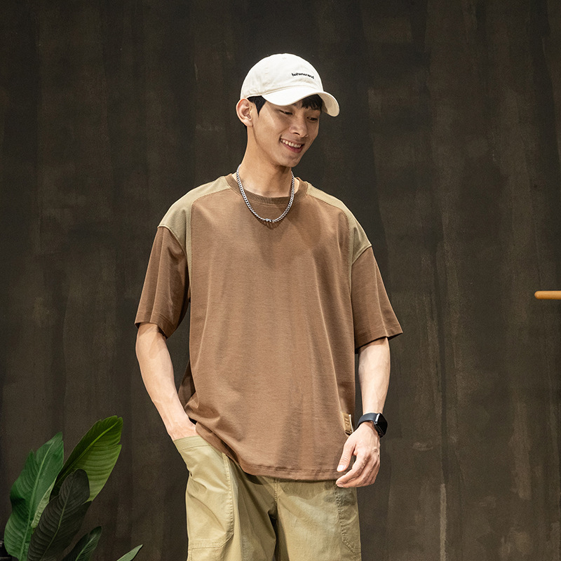 高級リヨセル混紡コントラストカラーステッチ半袖Tシャツメンズ夏アメリカンレトロルーズカジュアル通気性シャツ