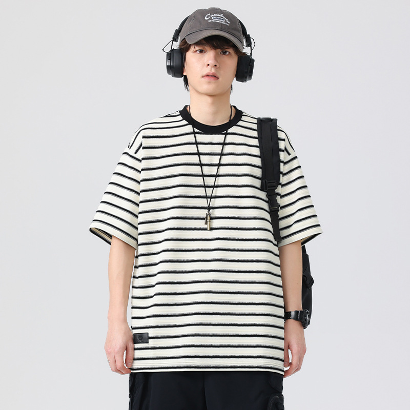 夏の新しい半袖 Tシャツメンズストライプルーズ日本レトロ Tシャツカップルスタイル多用途カジュアルラウンドネックトレンド