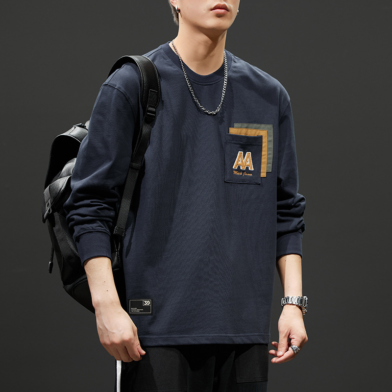春と秋の赤ちゃんの青い丸首の重いポンドの衛衣の男性の大きいサイズの新型のゆったりしている大きいサイズの純綿の長袖のtシャツは帽子の上着がありません。