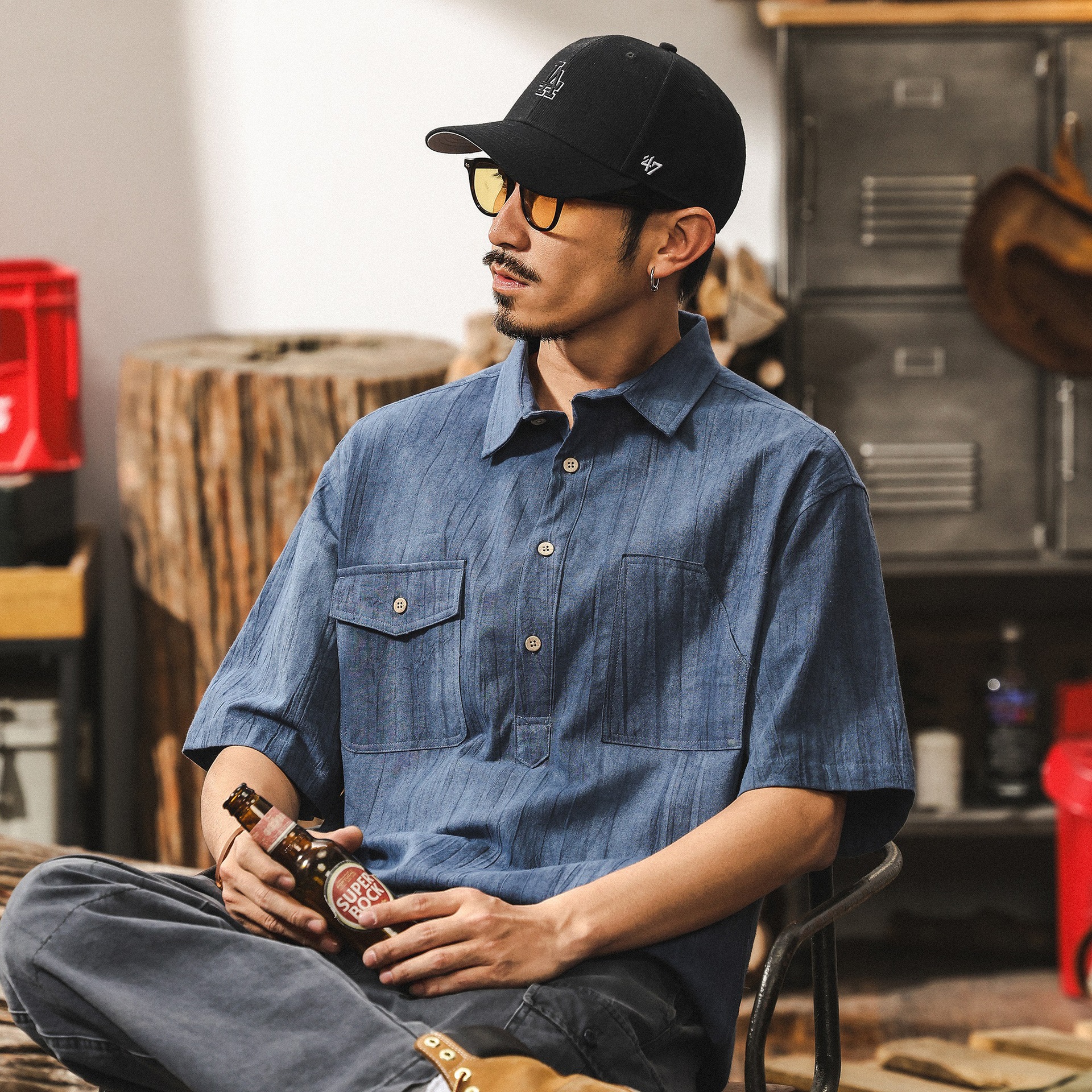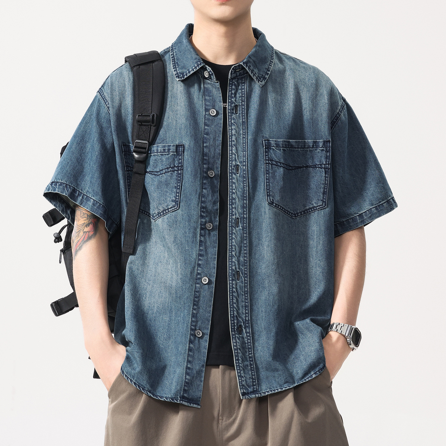 高級ウォッシュデニム半袖シャツメンズ夏ルーズ大きいサイズシャツトレンディなレトロダメージ加工メンズジャケット