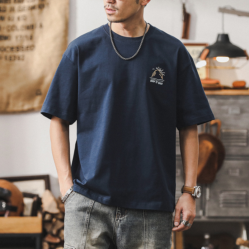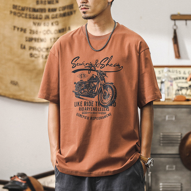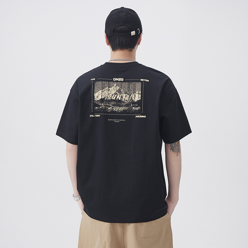 250 グラムヘビーウェイトラウンドネック半袖 Tシャツメンズトレンディなマウンテンプリントトップ夏ルーズカジュアル半袖 Tシャツ