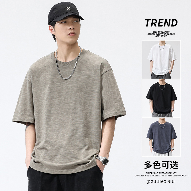 夏の新作ヘビーウェイトバンブーコットン半袖Tシャツメンズルーズカジュアルラウンドネックトップアメリカのトレンディなブランド半袖Tシャツ