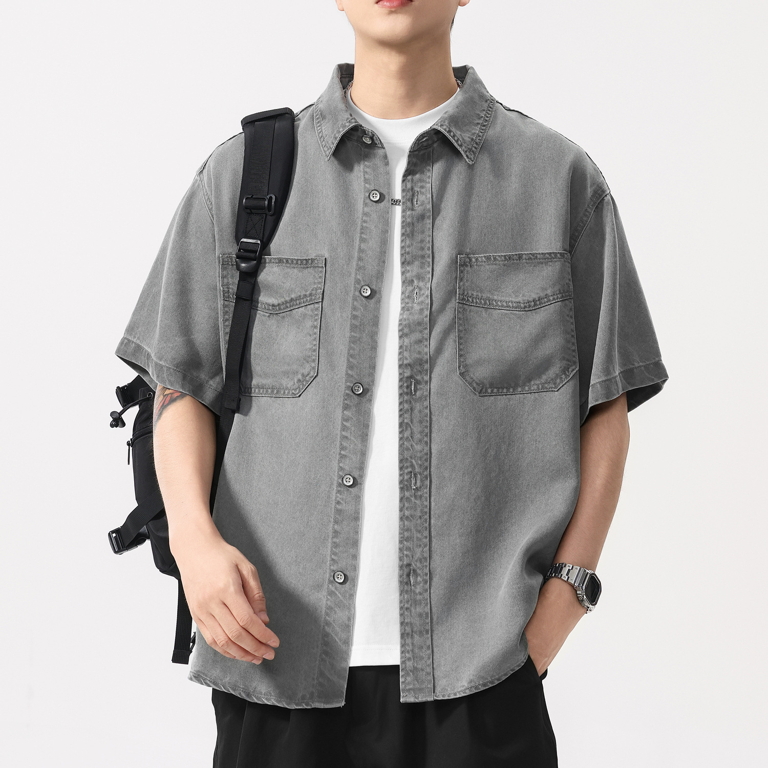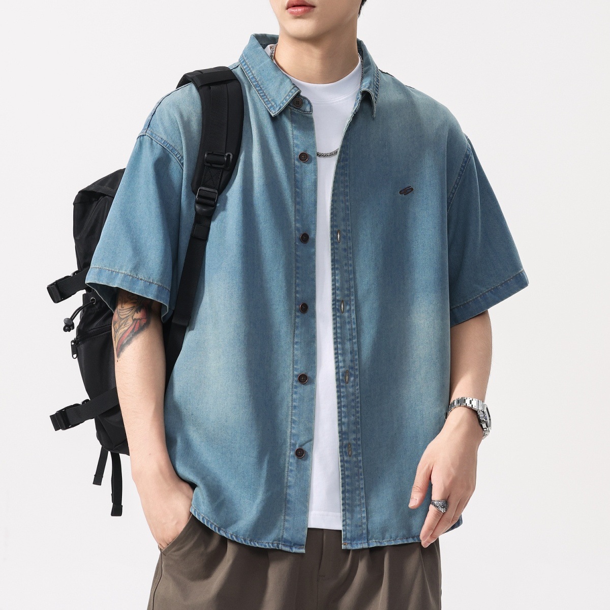 レトロウォッシュリヨセルテンセルデニムシャツメンズ夏の新しいルーズ大きいサイズ半袖シャツカジュアルジャケット