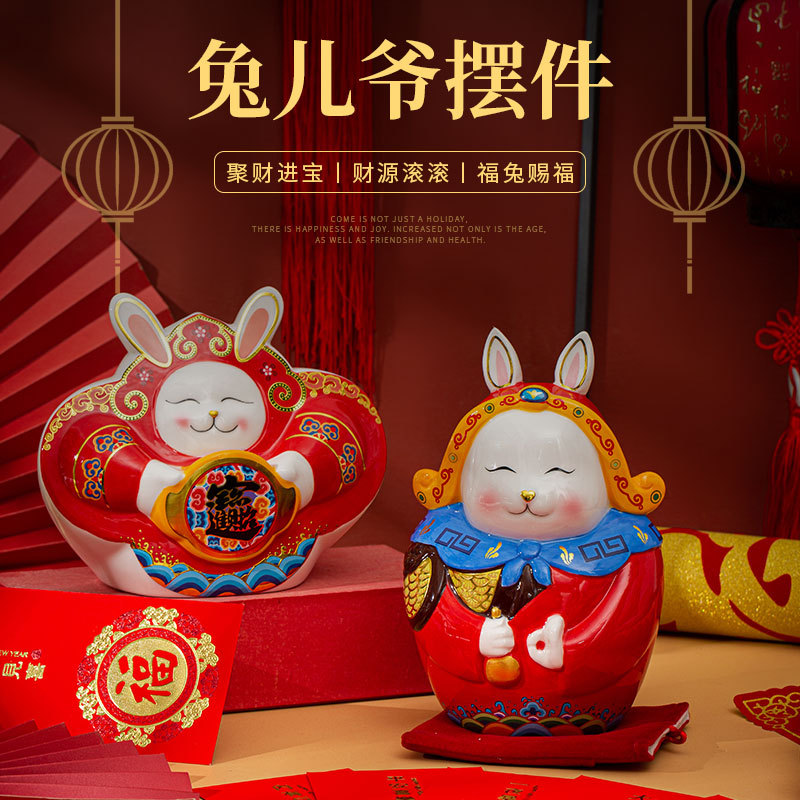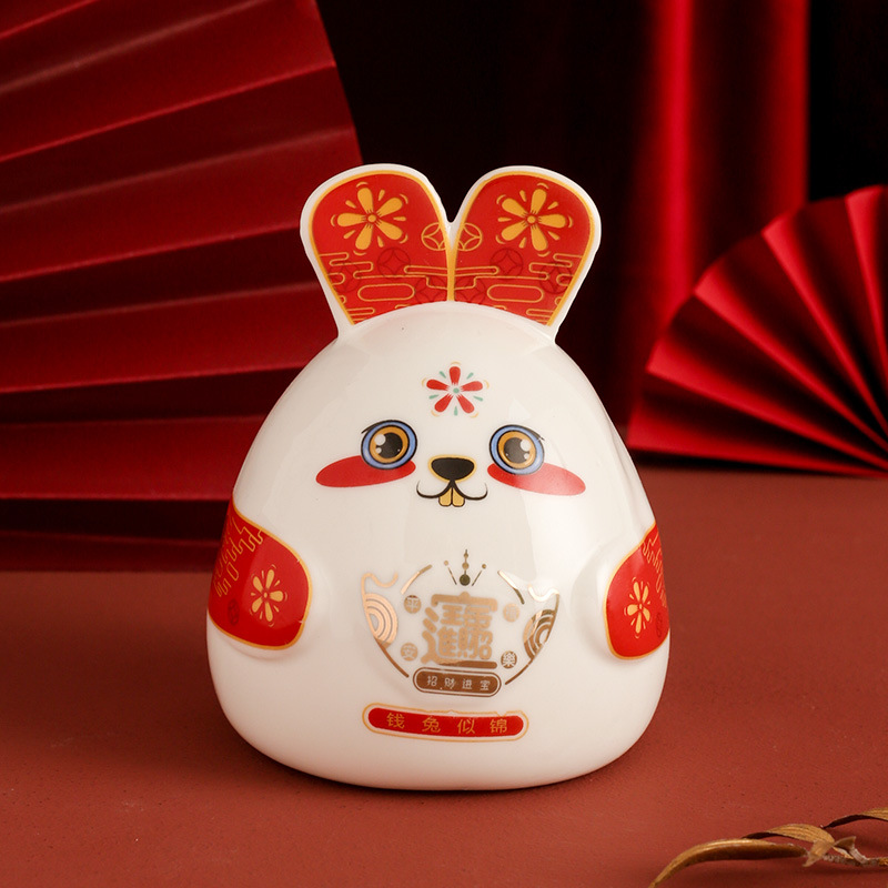 陶磁器のウサギの年のマスコットの生肖のウサギの息子の置物はお金を貯めて貯金箱の店をオープンしてレジの家庭の贈り物をオープンします。