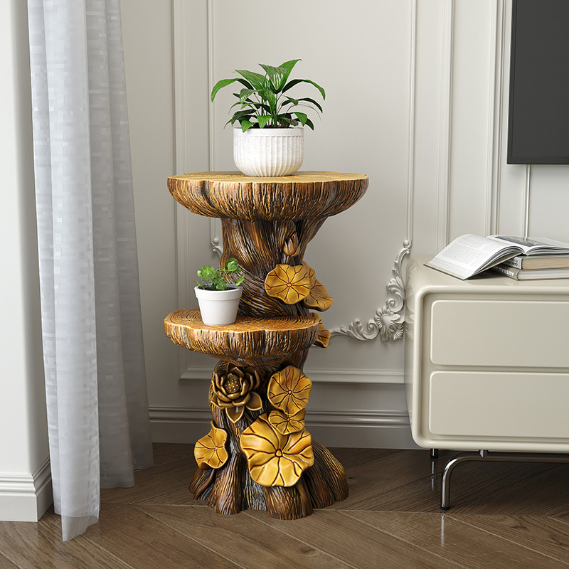 リビングルームの大きな床置き装飾品、テレビキャビネットの横にある木製の家庭用装飾鉢植え収納、木の切り株の根の彫刻工芸品
