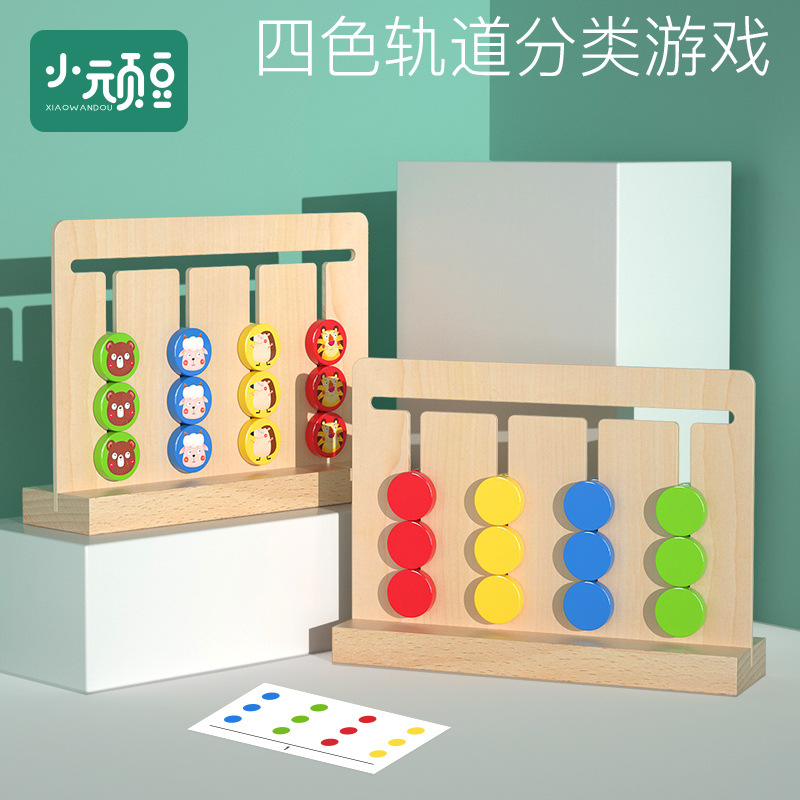四色のゲームの子供の木製の色は分類して位置を離れます。