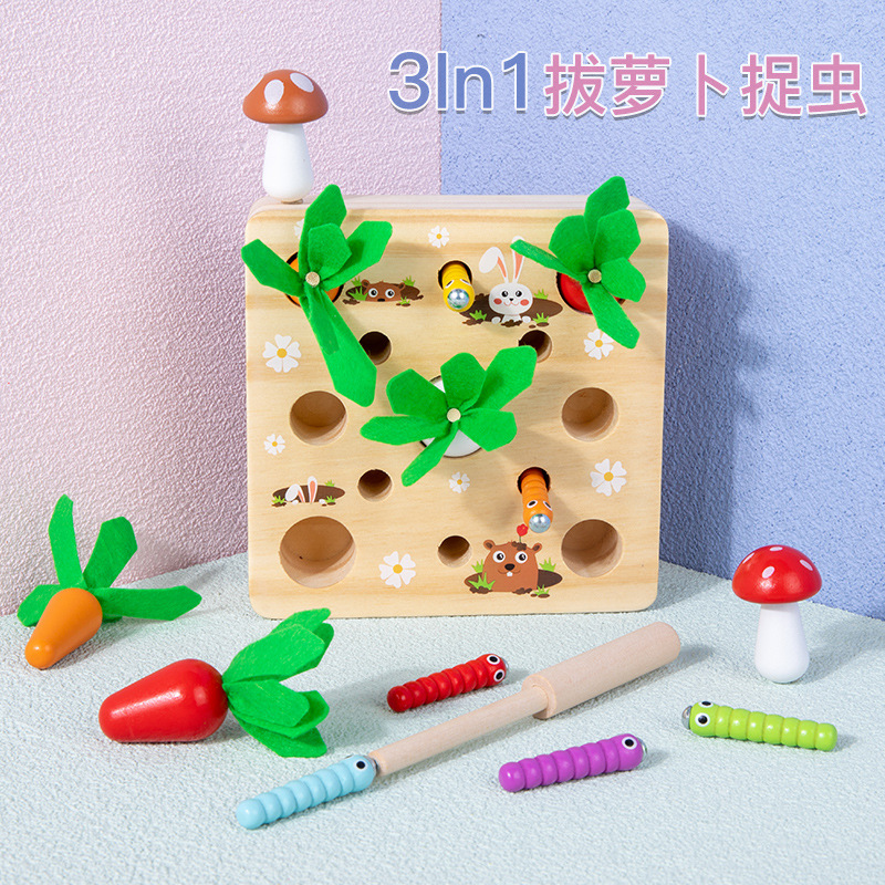 子供の木製のおもちゃの農場は大根を抜いて虫を捕まえます。