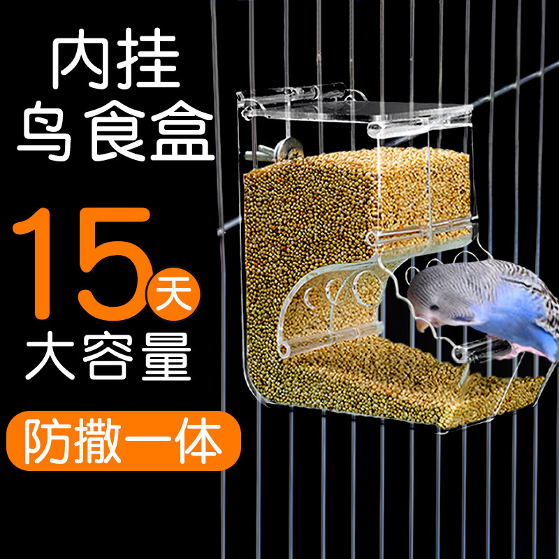 オウム掛け式給餌器はね防止鳥食箱には、自動的に供給される谷殻分離給餌鳥神器用品が掛けられている