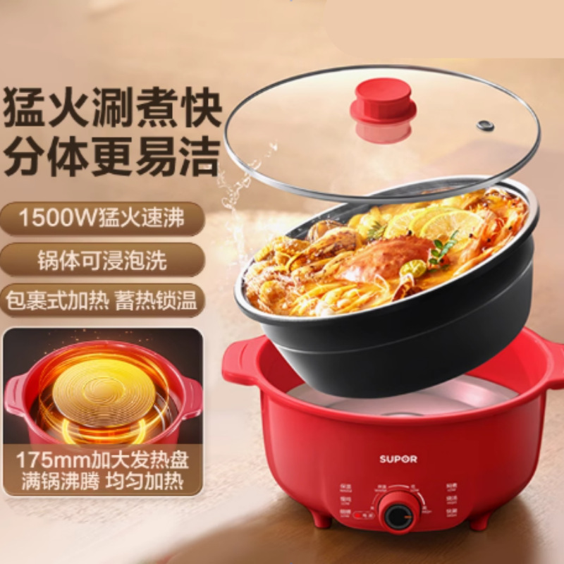 Supor 電気鍋 家庭用 分解洗浄可能 高火力 急速沸騰 5L 大容量 ノンスティック 多機能電気鍋