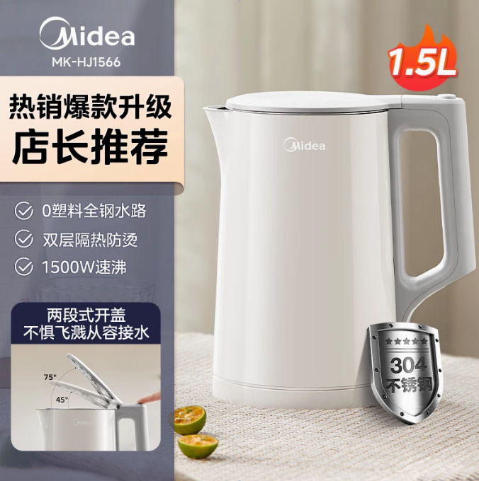 美しい電気ケトルMK-HJ1566家庭用304ステンレス二重防熱シームレス内胆電気ケトル1.5L