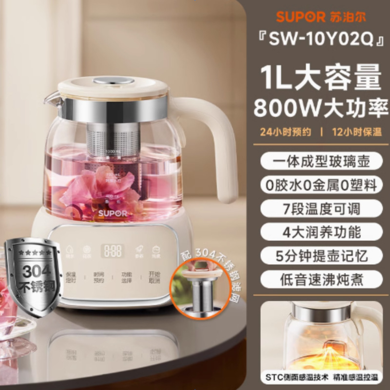Supor オールガラス健康ポット 1L 健康カップお茶沸騰家庭用ティーポット断熱フィルター付き SW-10Y02Q
