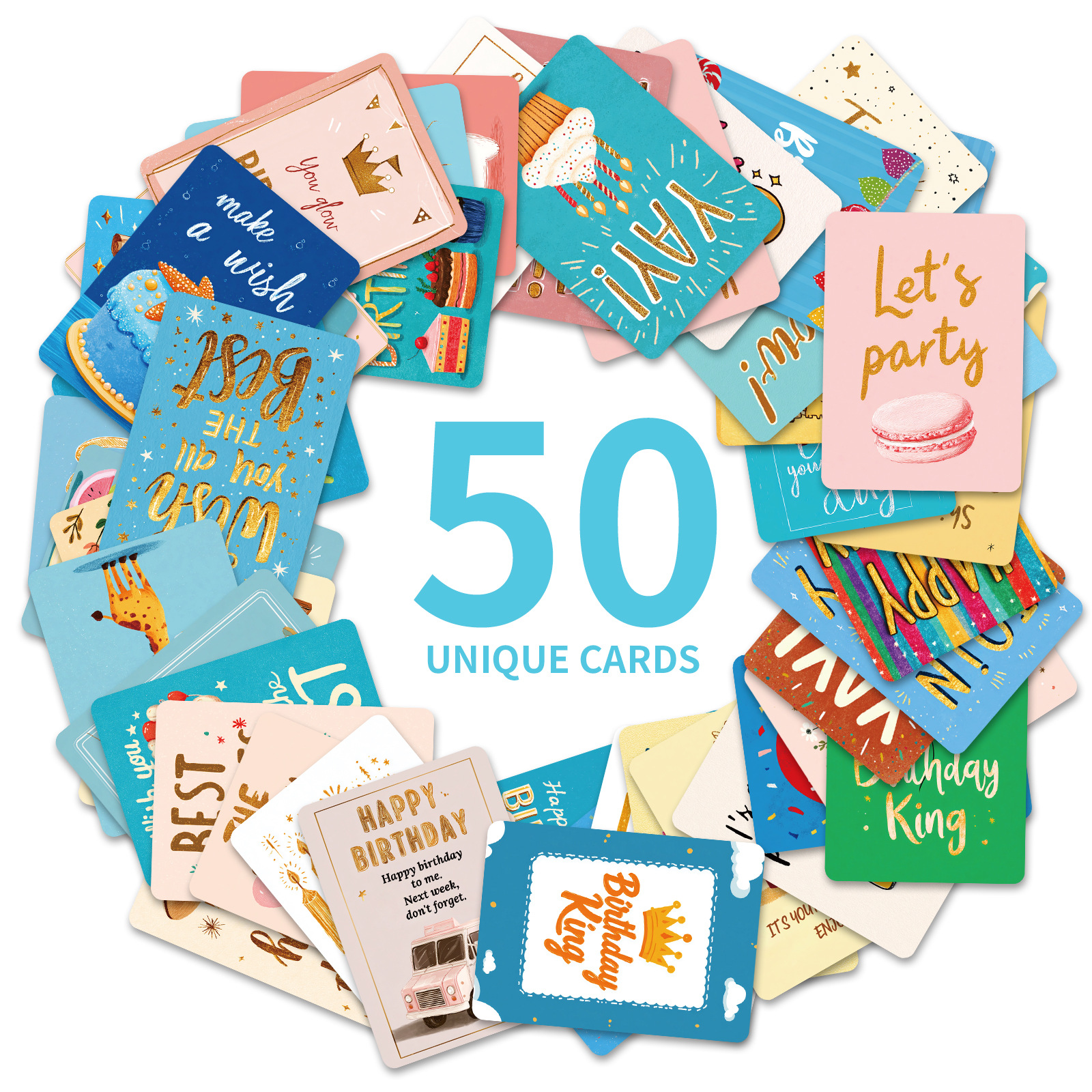 50 枚の新しい国境を越えたハッピーバースデーテキストカード、小さな新鮮な漫画の手書きの祝福の誕生日グリーティングカード卸売