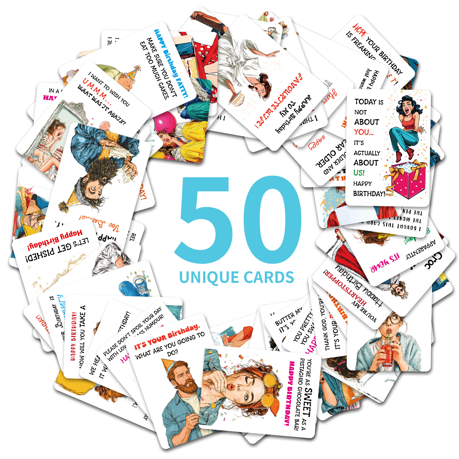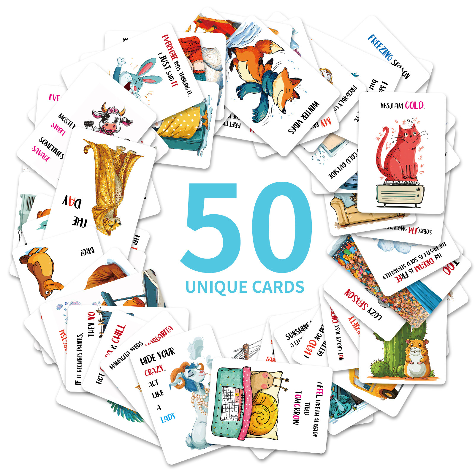 50枚の新しいクロスボーダーユーモアテキストカード、恥ずかしさを和らげるための漫画イラスト、完全英語のインタラクティブな小さなカード