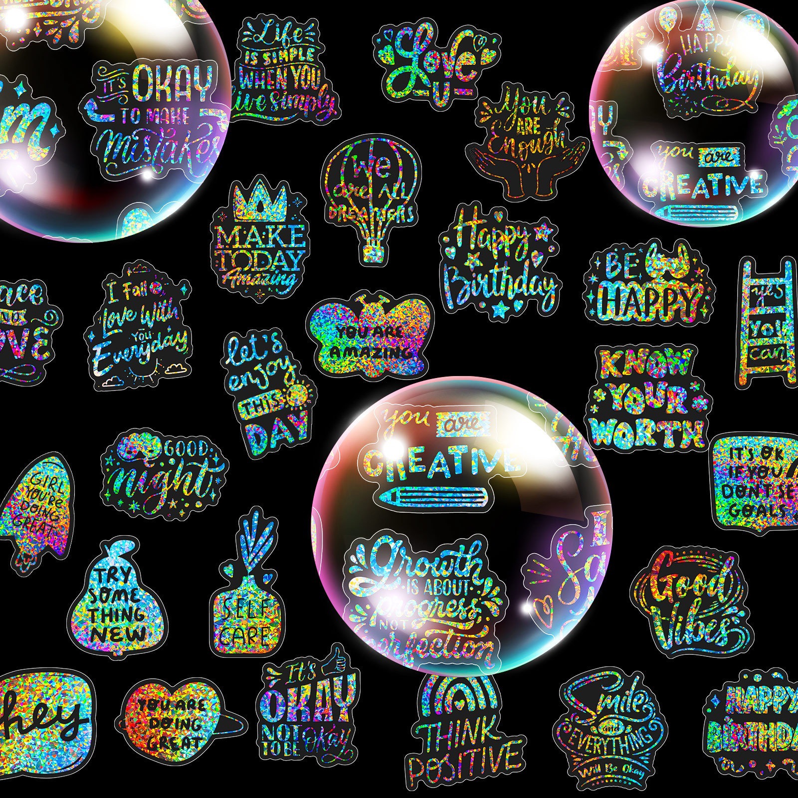 シルバーレーザーインスピレーションテキストPETステッカー50枚、カラフルな英語の短い文章、麻ステッカー素材、装飾ステッカー