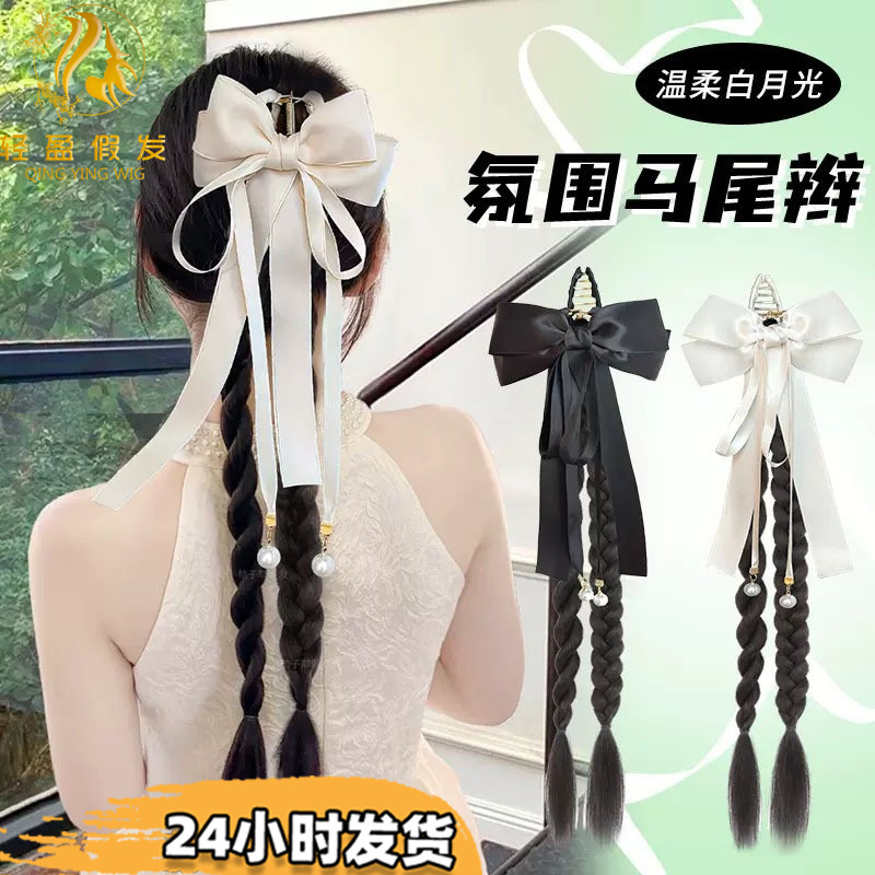 かつらのポニーテールの蝶結びの鞭は古風の漢服を挟みます。