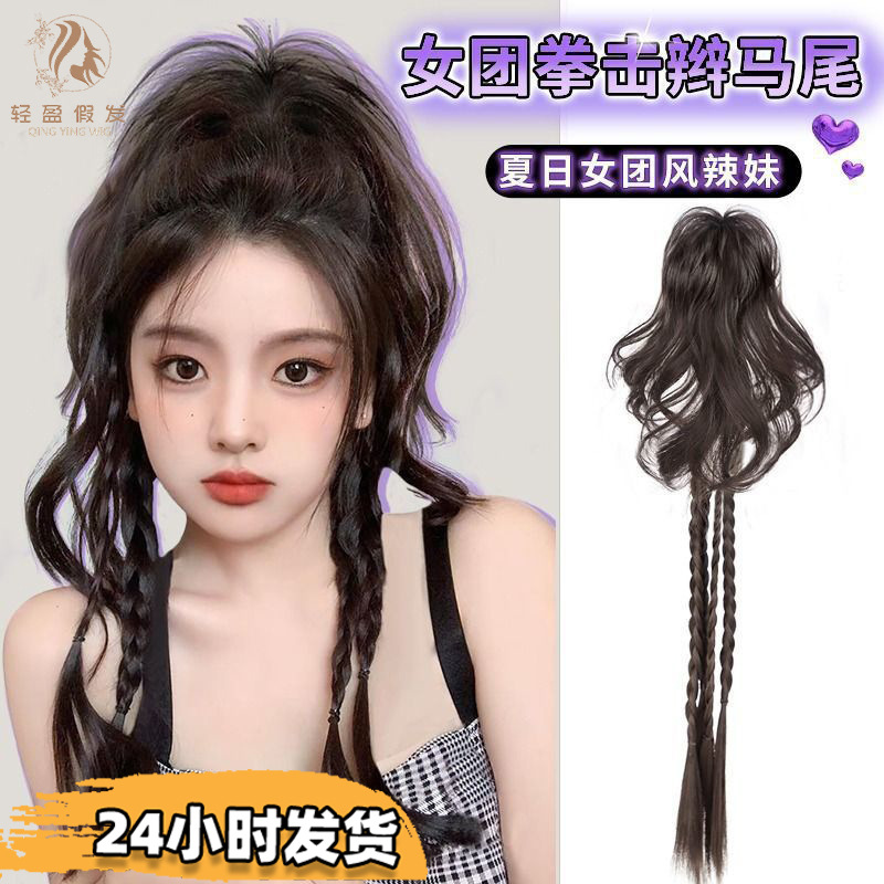 麻花のお下げのポニーテールのかつらはお下げをねじってお下げをします。