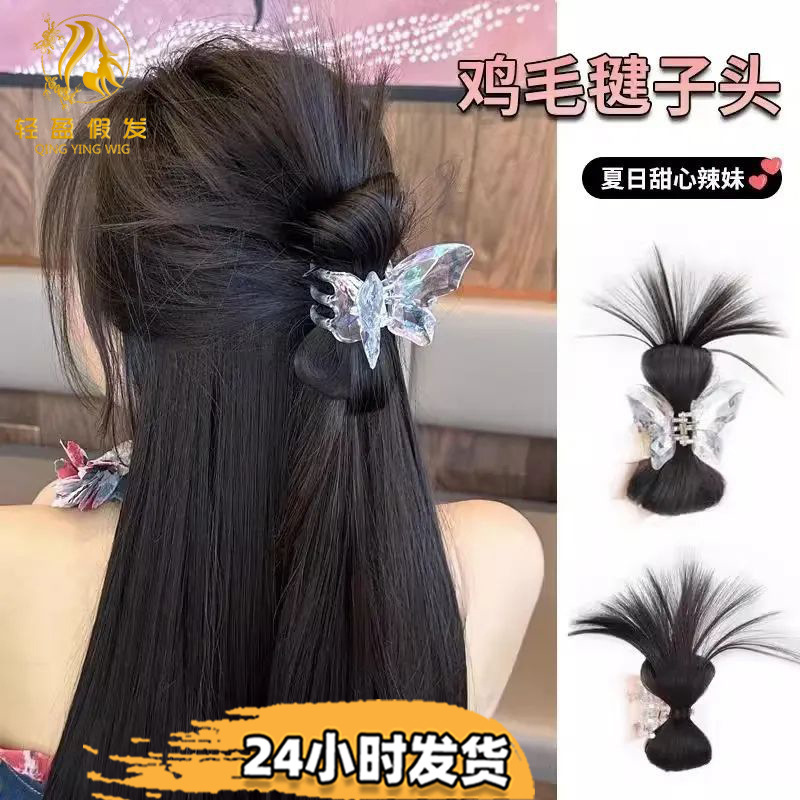 高馬の尾の団子の頭のかつらはぐずぐずしています。高馬の尾の蝶はギャルの鶏の巣のかつらをつかんで髪を包んで飾ります。