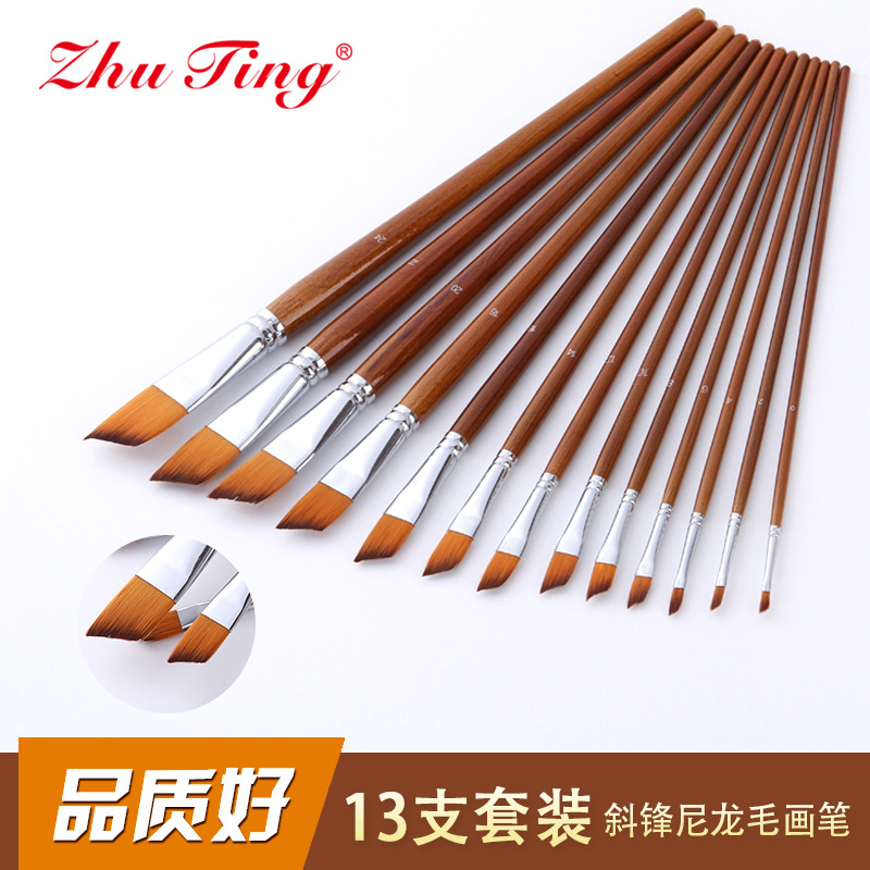 13本の斜めの峰の2色のナイロンの毛の長い棒の絵筆のアクリルの水彩の花の筆の学生は絵の筆の卸売りを描きます。