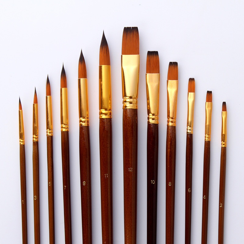美術用品12本の金色の管の2色のナイロンの毛の偏平な頭の水彩画のペンは先の油絵のペンの卸売りをカスタマイズできます。