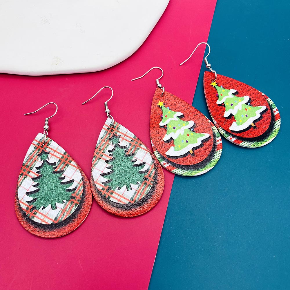 欧米国境を越えて人気のクリスマスイヤリングクリスマスツリー赤格子キャンディー両面プリント水滴革イヤリング