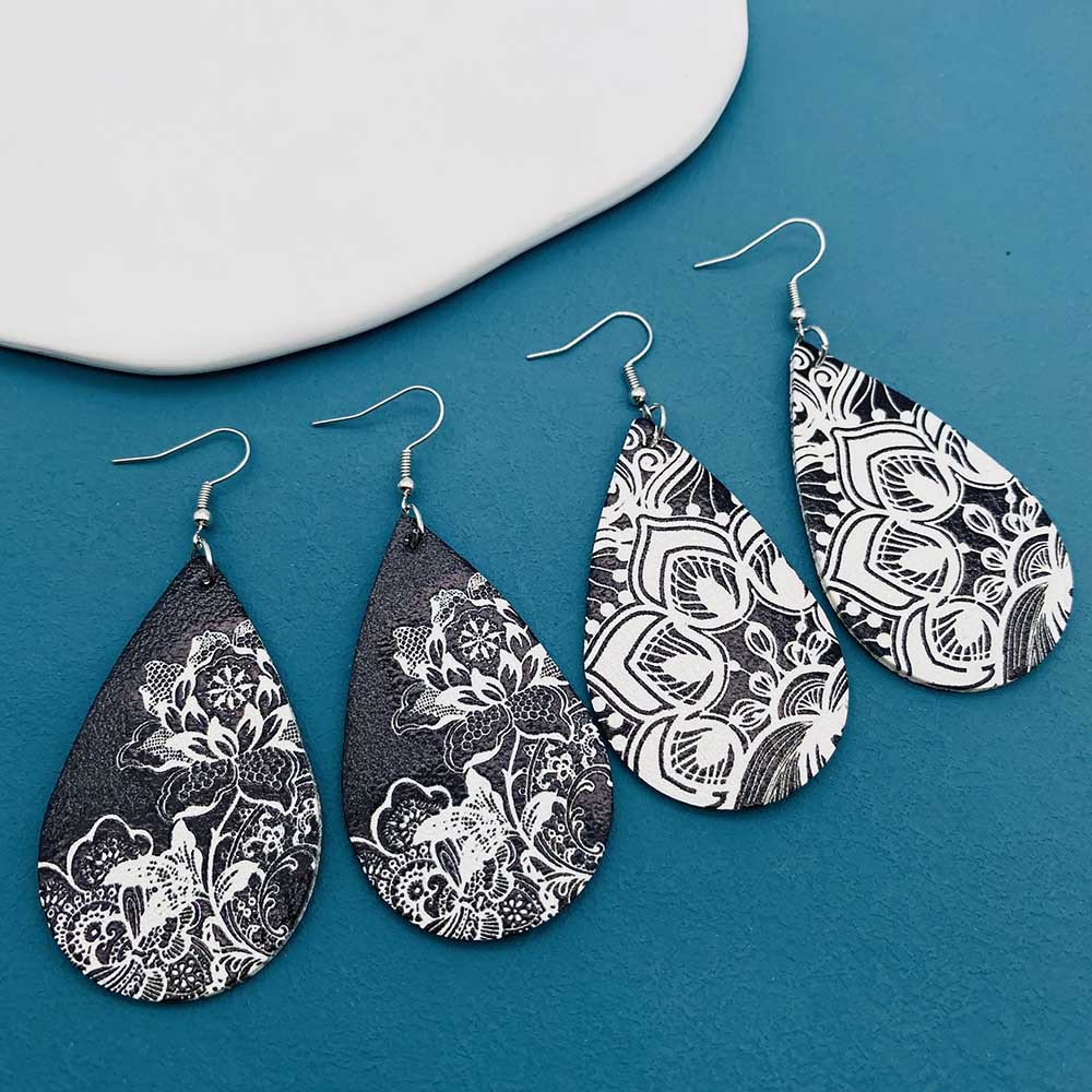 レトロな民族風イヤリングボヘミア水滴イヤリング花卉両面プリントpu革イヤリング欧米耳飾り