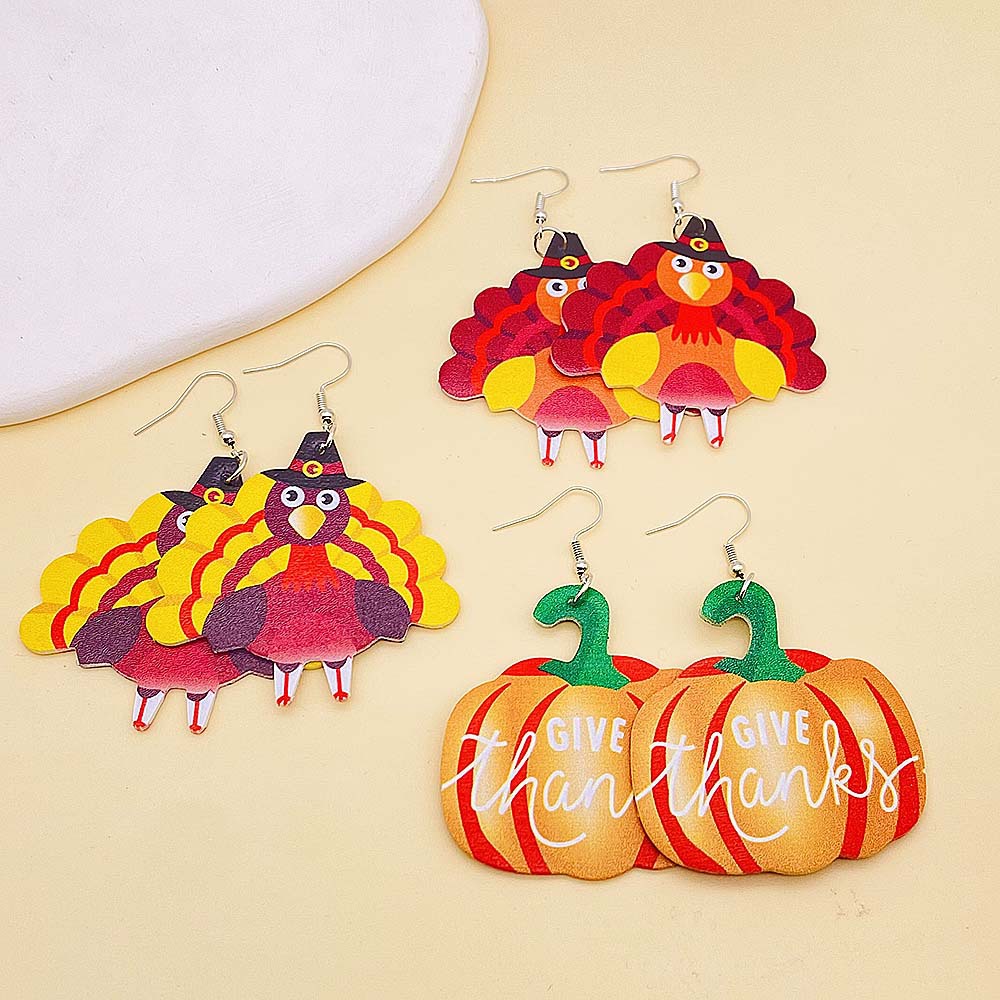 新しい感謝祭七面鳥イヤリングカボチャ帽子両面プリントレザーイヤリング欧米の人気クリスマスアクセサリー