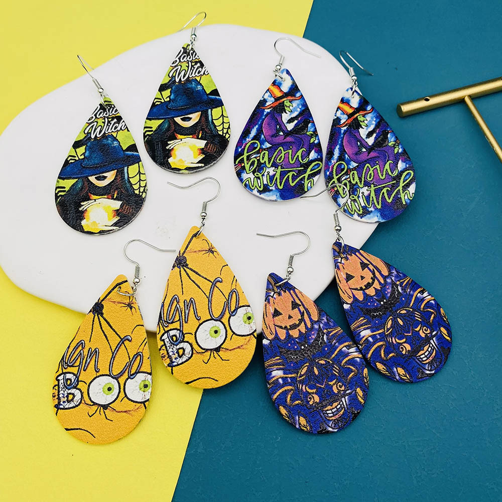 新しいハロウィーン革イヤリング緑目事件現場魔女両面プリント水滴イヤリング