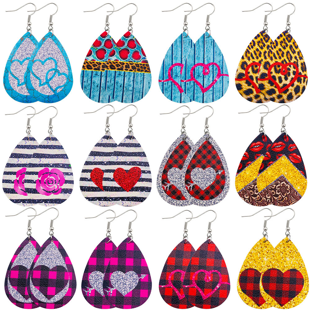 新しいバレンタインデーの皮革のイヤリングのヒョウの紋様の赤い格子の愛の両面のプリントの皮革のイヤリングの欧米の祝日の装飾品
