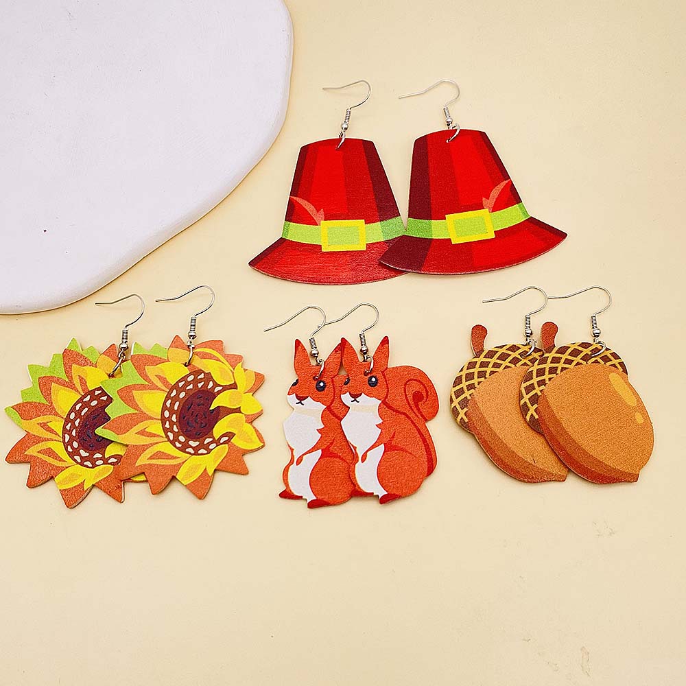 感謝祭イヤリング太陽花リス松果両面プリントpu革イヤリング欧米国境を越えた祝日アクセサリー
