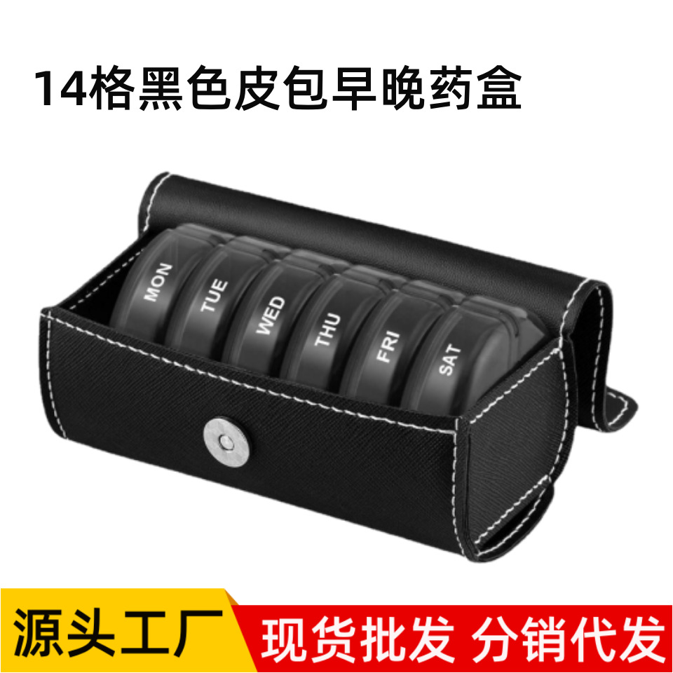 アマゾンの新しい14格の黒い皮の薬の箱の便利なppのプラスチックの錠剤の収納箱の朝晩の薬の箱