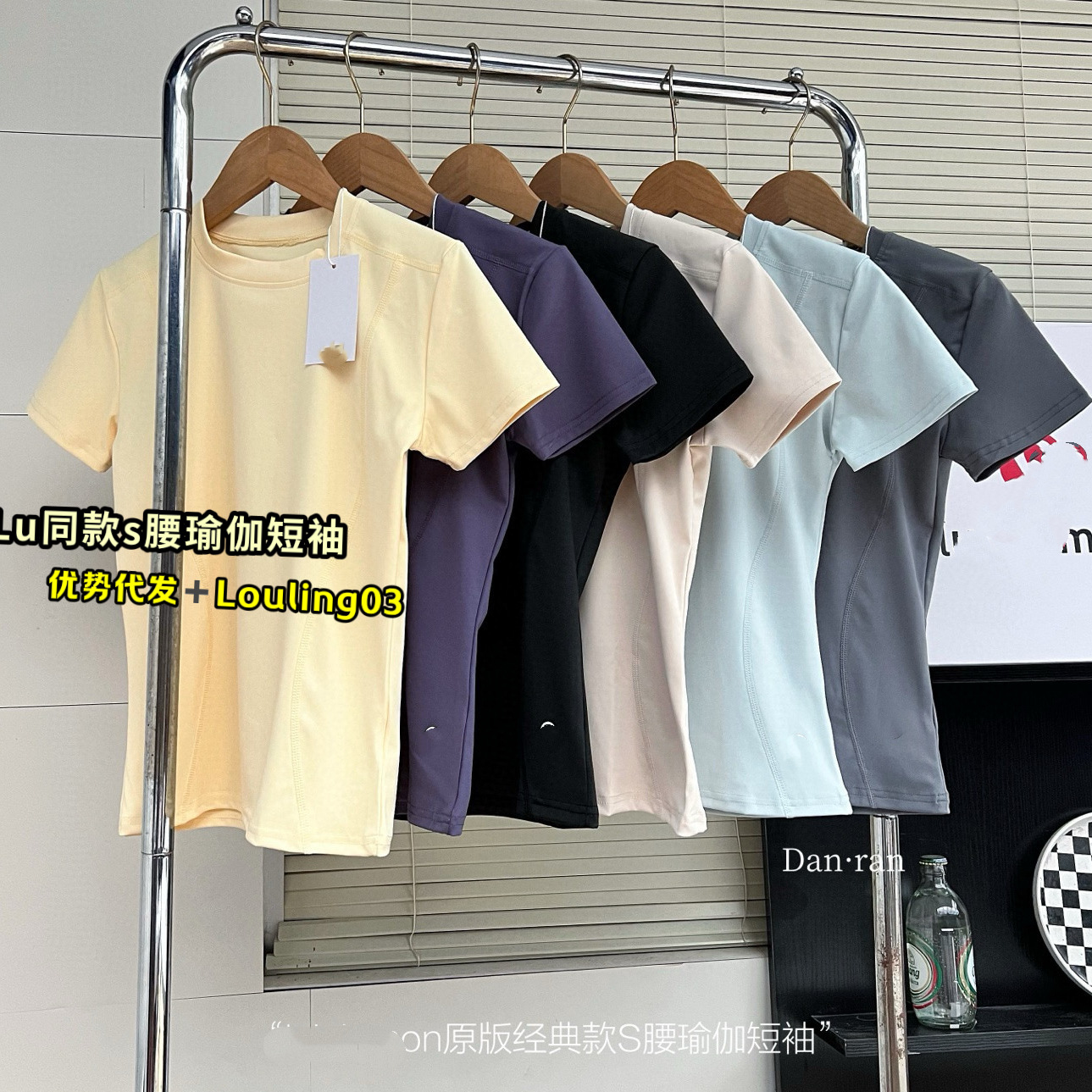 ルルと同じスタイルのタイトなSウエストヨガ半袖Tシャツレディースサマースポーツフィットネスランニングトップラウンドネックキャンディーカラー