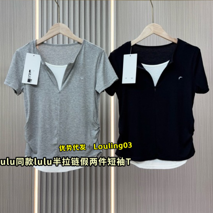 ルル同風ハーフジップフェイクツーピース半袖Tシャツレディース夏新作プリーツウエストVネックイレギュラートップ